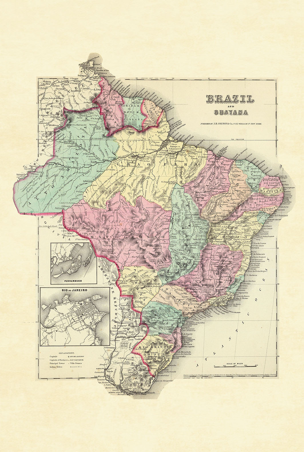 Affiche carte Brésil et Guyane 1856 - Régions enluminées avec détail de Rio de Janeiro